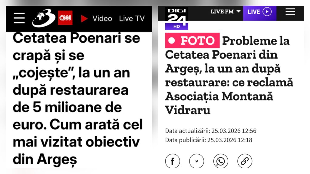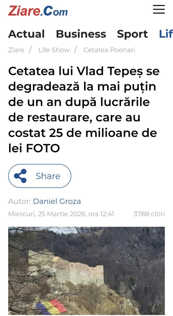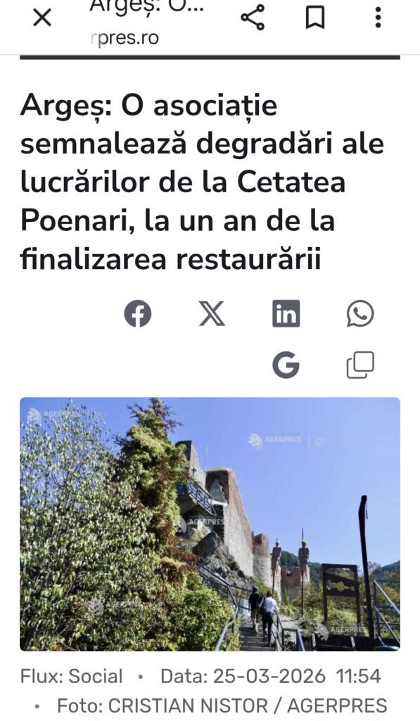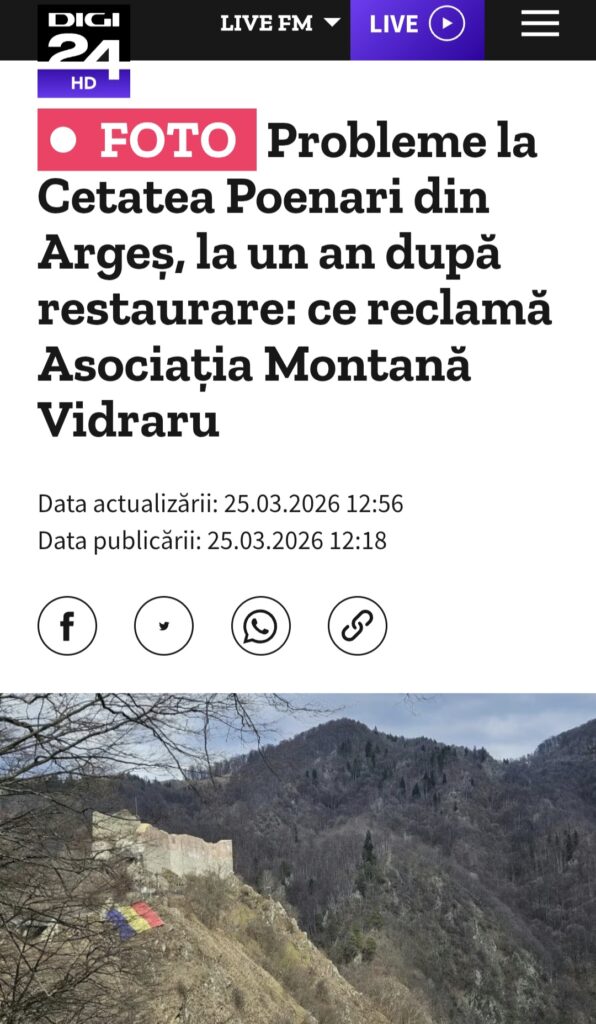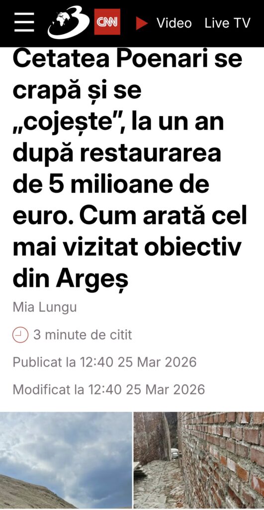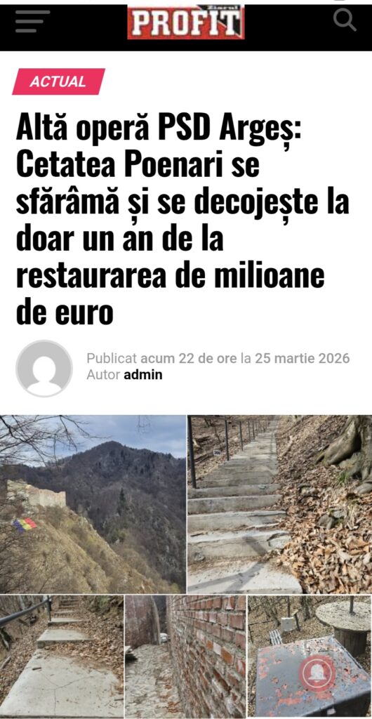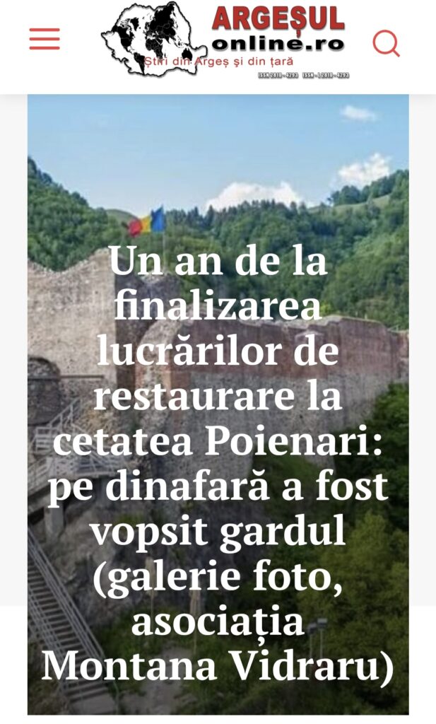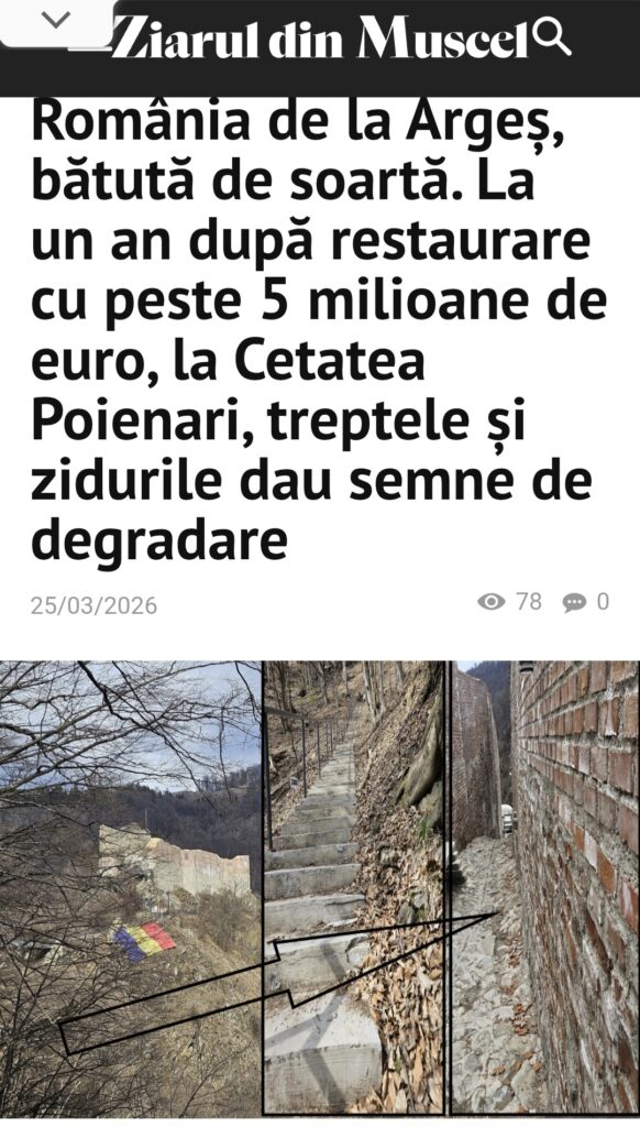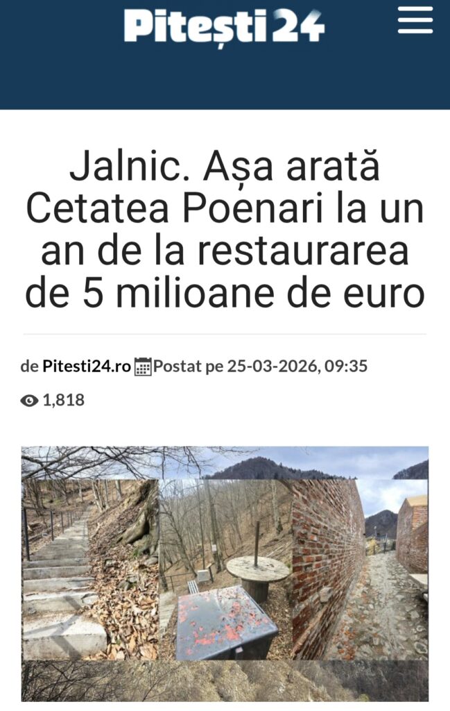 Județul Argeș a ținut din nou, ieri, prima pagină a știrilor la capitolul „așa nu”. În toată presa din Argeș, cât șila nivel național, Digi, Antena 3 CNN, Ziare.Com, Agerpres și alte site-uri nationale, a fost popularizată starea în care se află Cetatea Poenari, la doar un an de la restaurarea în care s-au băgat 5 milioane de euro.