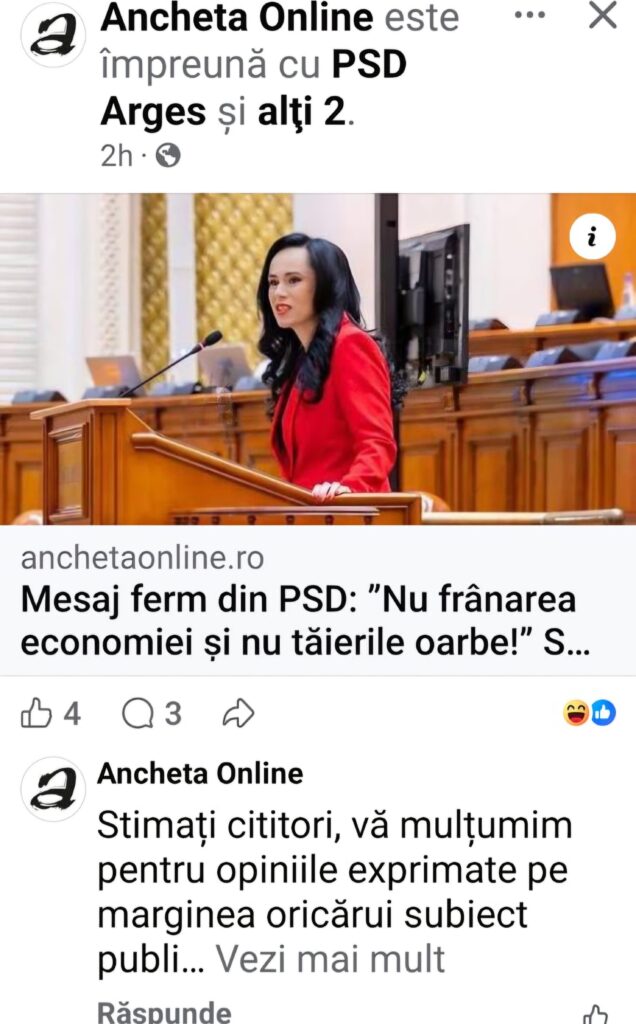 Fosta zână a pensiilor începe să scoată din nou capul crezând, probabil, că oamenii au uitat cât i-a mințit și ce dezastru a făcut ca Ministru al Muncii. Ultima ei postare, în care, cu nesimțirea politică ce o caracterizează, le explică oamenilor cum situația în care ne aflăm acum e datorată faptului că nu sunt aplicate soluțiile PSD-ului, de parcă PSD-ul ar fi în opoziție, de parcă PSD-ul nu e la guvernare de ani de zile, a dezlănțuit un adevărat val de nemulțumire în rândul oamenilor, care, se pare că nu au uitat cum a făcut ea pe starleta TV, luni de zile, pe la televizor, promițând măriri de pensii și trai mai bun. Iată că oamenii n-au căzut pradă tupeistei politice de la Mihăești care a încercat, încă o dată, să pozeze în zâna suavă a PSD-ului, interesată de soarta oamenilor și s-a smiorcăit în stilu-i fals, caracteristic, pe facebook. Dar, vorba celebră, ghinion! Oamenii nu o mai cred. Nici n-a apucat bine să își posteze emanația politică, prin care încearcă nu doar să revină în preferințele electoratului dar, mai ales, să devină mai frecventabilă în cadrul propriului partid, că oamenii s-au și pus cu comentariile nasoale pe ea. Oprobiul public a fost atât de mare încât, pe site-ul unui ziar local, care a distribuit postarea miorlăită a Simonei Bucura, administratorii au simțit nevoia să pună un comentariu în care îi roagă pe oameni să nu mai înjure.
